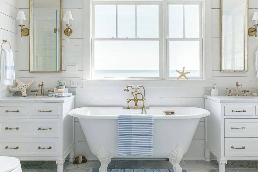 Light, breezy palettes: Soft blues, seafoam greens, and sandy taupes echo the Atlantic and bring a sense of calm. We often pair these with crisp white trim and brushed-nickel or champagne-bronze fixtures for a fresh, beachy feel.